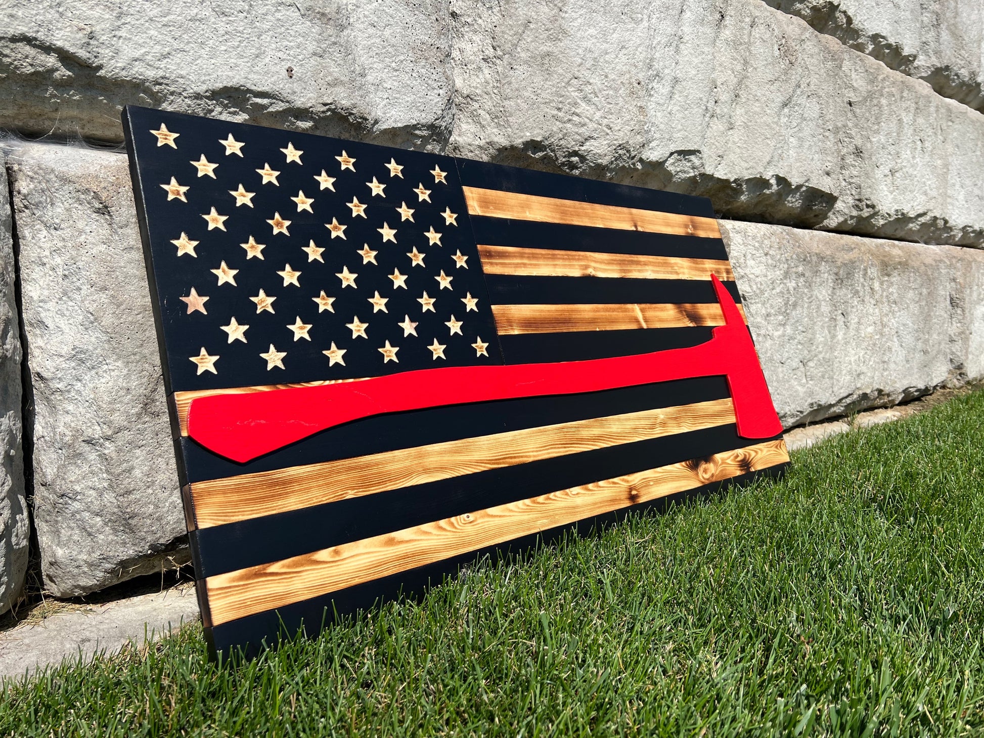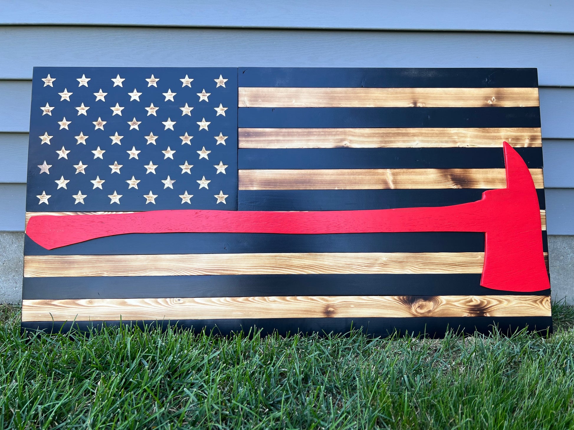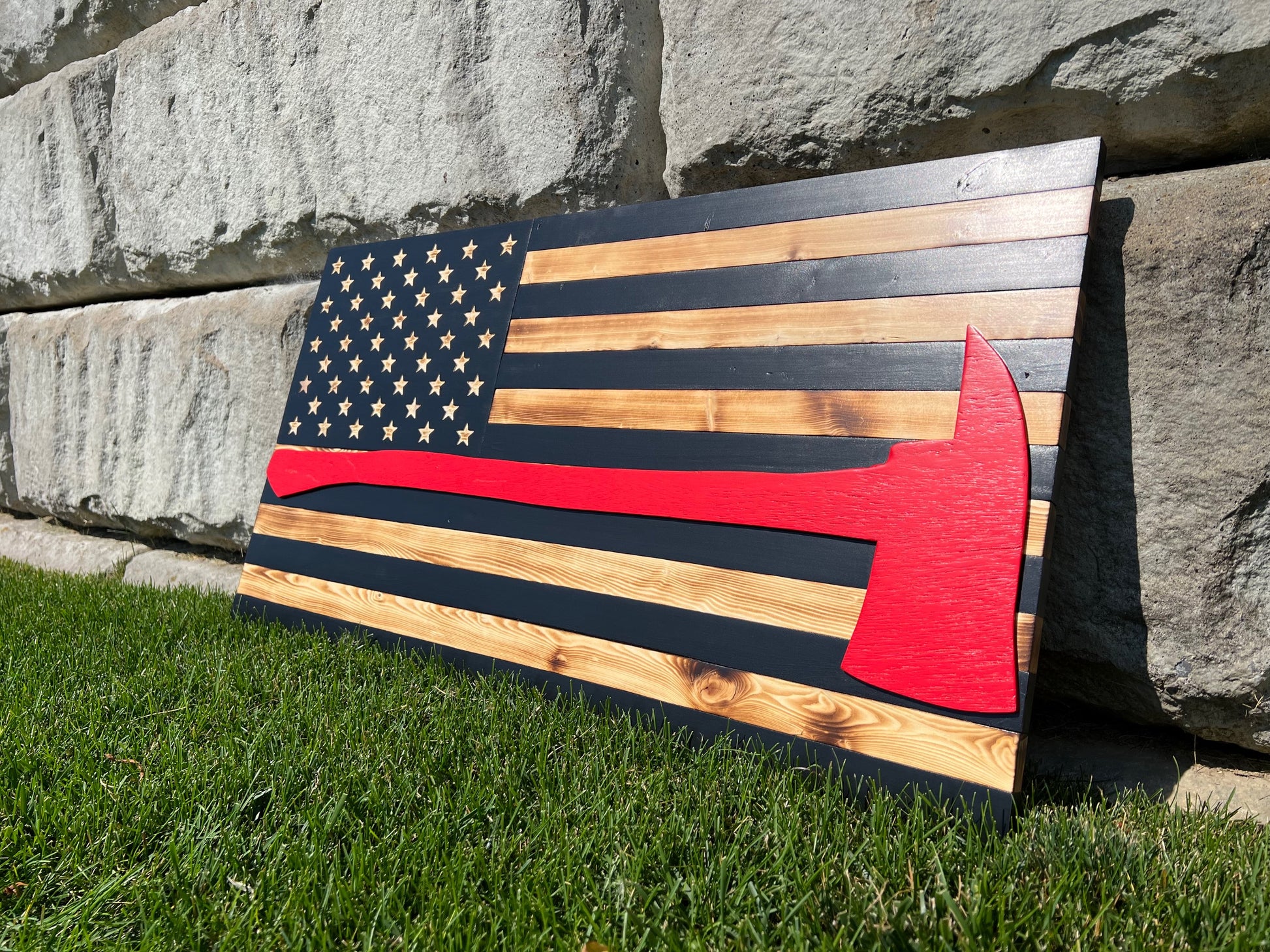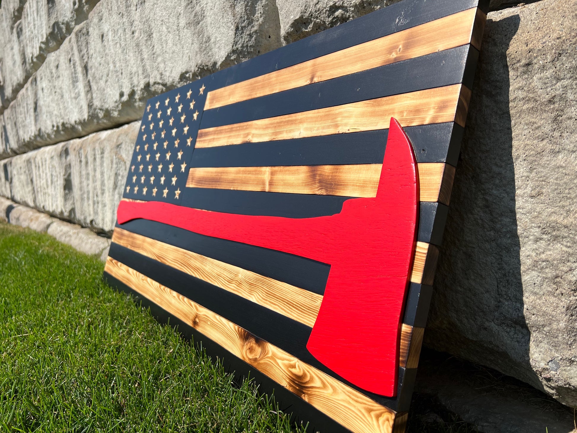 Wood American Flag | Handmade | 50-star Union | Black & White w/ Red Firefighter Axe